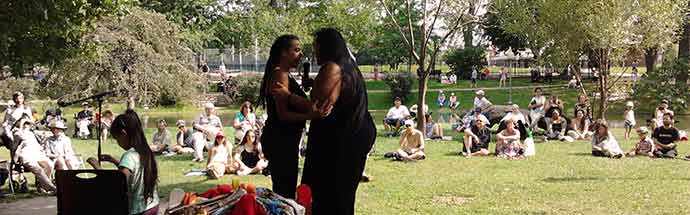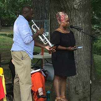 Then, it was the turn of a performing duo of Bajan-Canadian poets: Jason ‘Blackbird’ Selman with his trusty trumpet that soulfully sounded through the park as only horn music can do and who performed in tandem with his wife Deanna (D’Na) Smith resplendent in an African Ankara print inspired head wrap and a black eyelet patterned dress. So simple, yet visually stunning. After playing and then performing his own poetry, he accompanied Deanna, underscoring and emphasizing her powerful melding and play of words with the subdued but plaintive sound of the trumpet. Goosebumps all round!