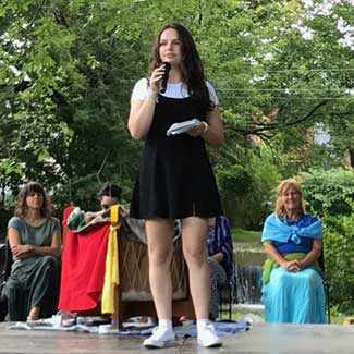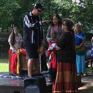 Longhouse Faithkeeper Niioie:ren Patton, resplendent in her wonderful Wolf cape (shawl) and beaded wolf embossed hairpiece “Simply made my day,” said Wanda Potrykus, organizer and MC for the afternoon, “since I had been informed only at 10:30 am that morning that Ka’nahsohon Deer, our invited guest, could not arrive in time, and although he did let me know he had sent out a request to others to see if they could step in and help, I was not truly expecting anyone to actually jump in a car and make their way to Westmount Park on such short notice… and then to be so pleasantly surprised, by an email announcing not one last-minute replacement but three magnificent, wonderfully warm people, who honestly I had not imagined would actually materialize… but they did.”