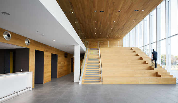 Golden accents and oiled oak plank siding warm public spaces in contrast to the cold whiteness of the envelope. Some brick surfaces of the original building have been preserved and dyed black. They serve as a support for a wall of brass cut plates designed as part of the arts integration program.
