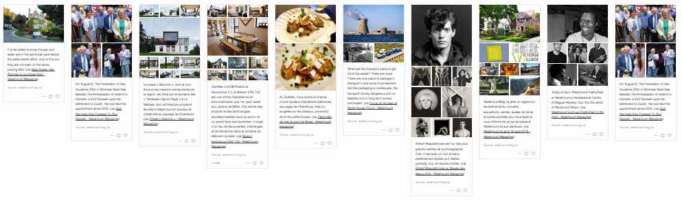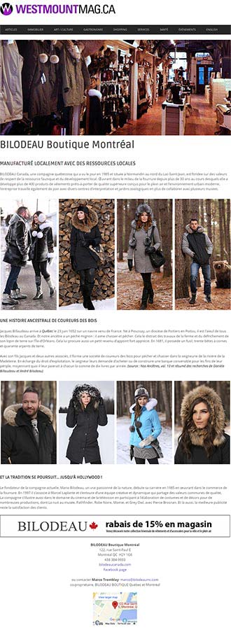 We publish a dozen articles and two newsletters each week. Our varied editorial line covers local community life, art, culture, entertainment, residential architecture and design, environmental and wildlife protection, real estate, health, wellness, nutrition and recipes. Additionally, WestmountMag.ca offers its readers profiles of local merchants and service providers, as well as exclusive real estate listings.