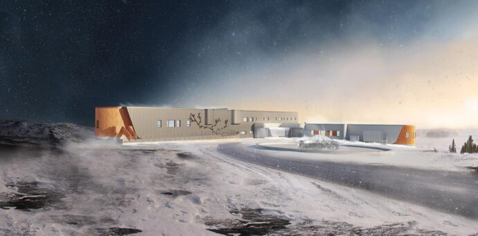 Station canadienne de recherche de l’Extrême – Arctique (SCREA) • photo : Alex Fradkin • Oeuvre d’art : Sammy Kudluk