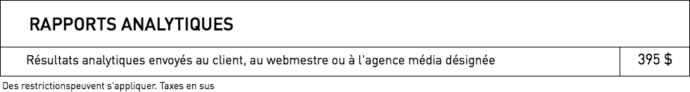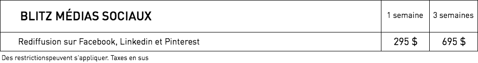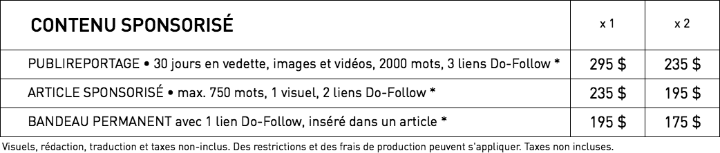 Tous les tarifs sont susceptibles d’être modifiés sans préavis. Certains frais de production pourraient s’appliquer. Taxes non-incluses.