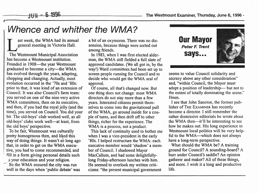 Il y a plus de vingt ans, le 6 juin 1996, l’ancien maire de Westmount, Peter Trent, a contribué un article intéressant au défunt Westmount Examiner, intitulé Whence and whither the WMA? (D’où vient et où va l’AMW ?). Dans ce document, il examinait brièvement l’histoire et le fonctionnement de l’AMW et son mandat. Dernièrement, un passage de cet article me revient à l’esprit, « la majeure partie de l’évolution s’est produite dans les années 70 et 80. Avant cela, (l’AMW) était en quelque sorte une extension du Conseil municipal ».