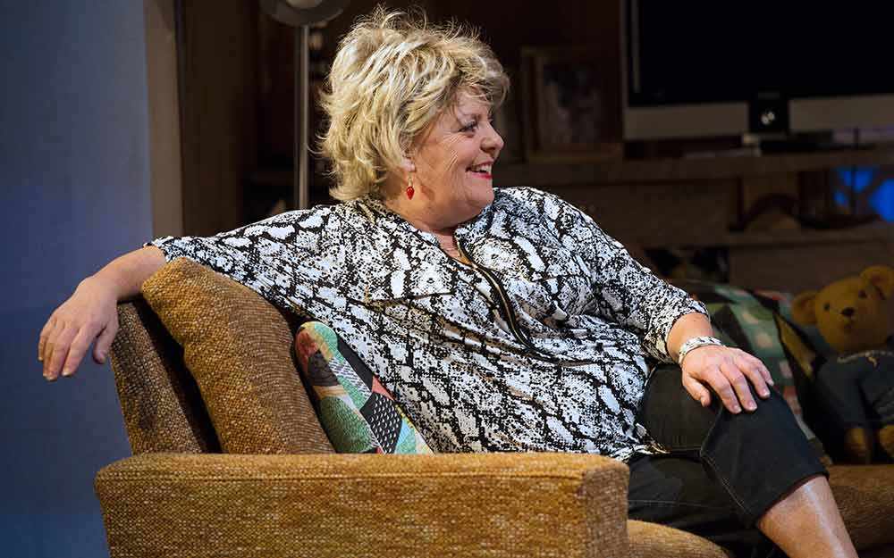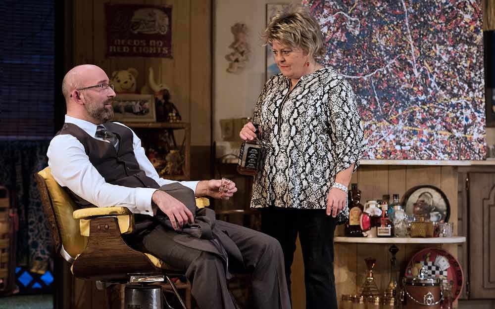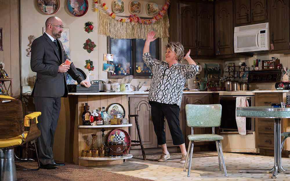 Welcome back to Centaur stage, the wonderful Nicola Cavendish. Noted for her Shirley Valentine portrayals across Canada, she is here Maude, a brash divorcee living in a trailer park surrounded by kitsch items she picks up at yard sales. One such item is a canvas with non-objective lines and dots, costing only $3. Informed later that it reminds one of Pollock, whose works now sell north of $50 million, she scrimps to bring Lionel (Jonathan Monro) the top Pollock expert to her abode for an evaluation.