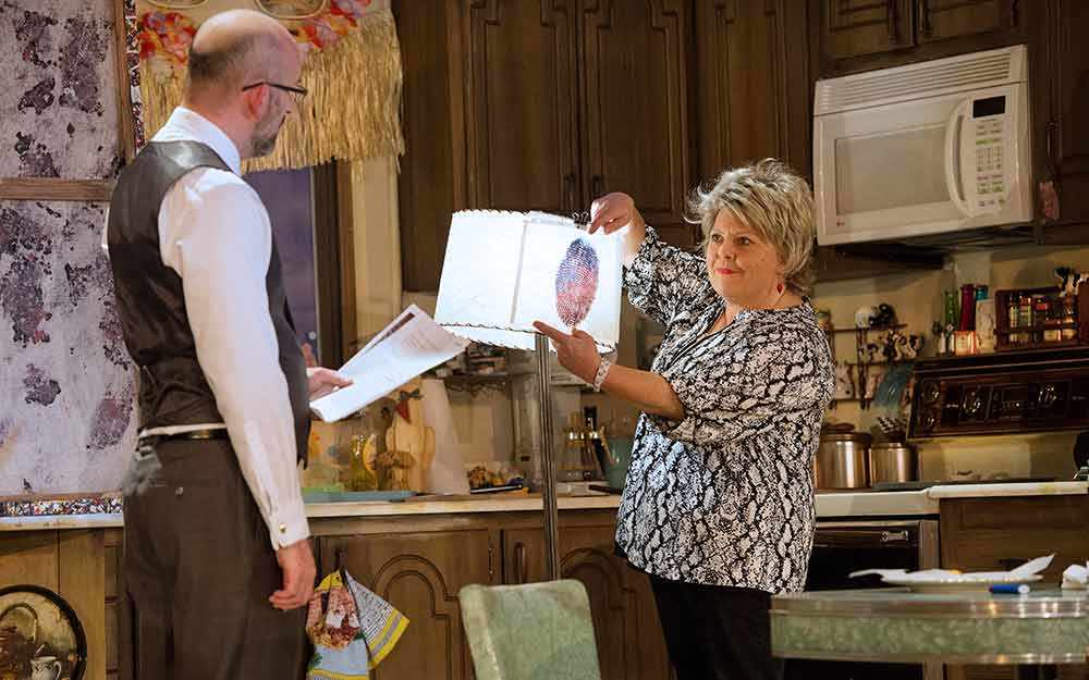 I loved the bit of stage business where Lionel, before viewing the canvas, “warms up” with stretches and breathings, much like an athlete or concert pianist. He rules negatively. This invokes a lot of class differences and even sexual innuendos. The prim expert who just ‘knows’ that the painting is not authentic vs. the earthy owner who ‘believes’ in her truth and even has a research trick up her sleeve.