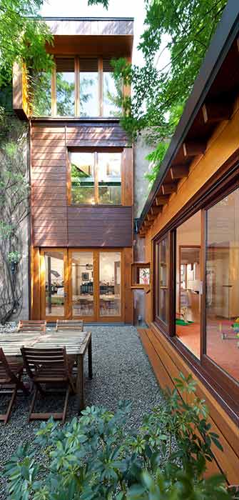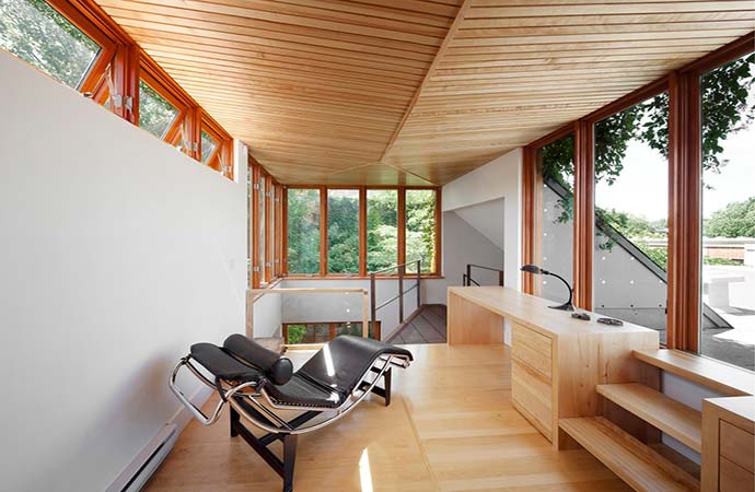 The transformation of the house was realized by adding two sleek volumes in glass and wood, with similar dimensions. One was delicately placed on the roof, while the other found its place at the back of the garden, under the protective shade of a large maple tree. To create a visual connection with the exterior, an opening was made in the existing facade on the courtyard side, rebuilt in wood to harmoniously link the two new structures.