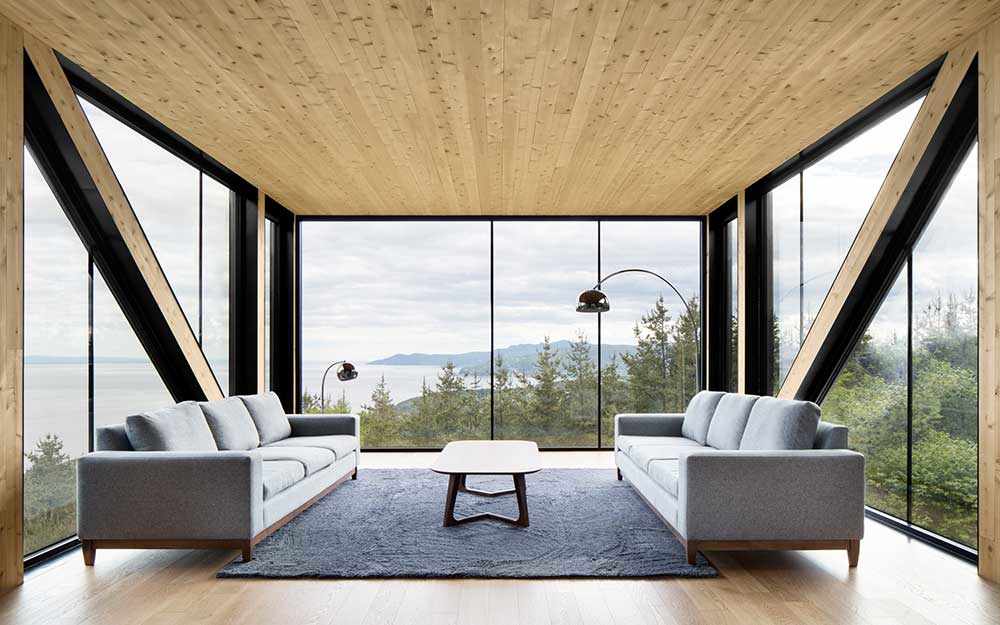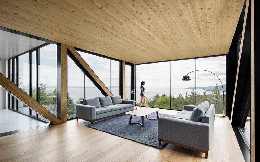This raised volume allows for a direct experience of the enchanting sunsets of Cap à l’Aigle and the shimmering reflections of the estuary of the St. Lawrence within the comforts of the home.