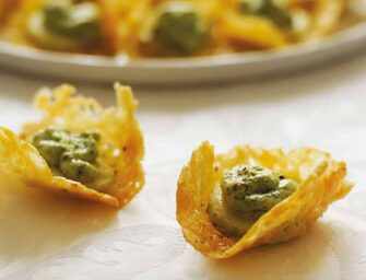 Une soupe merveilleusement texturée servie avec chips parmesan.Recette par Monique Singer