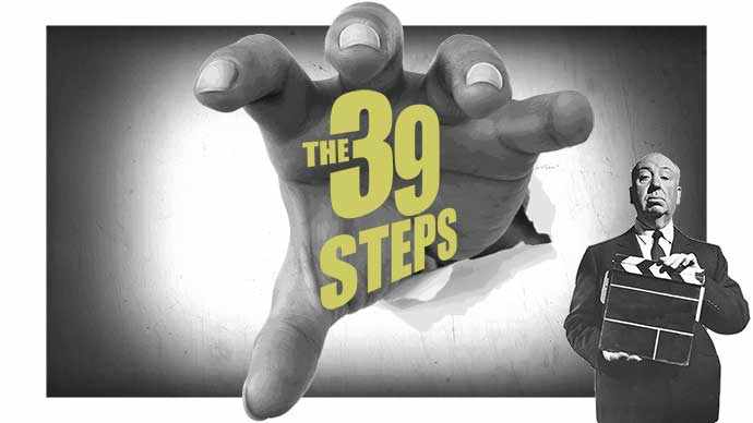 The 39 Steps is a fast-paced send-up of Alfred Hitchcock’s take on the spy adventure by British novelist, John Buchan. Hitch spruced up the all-male thriller by adding a couple of femme fatale types and kick-starting the action in a crowded London Music Hall. Those familiar with the 1935 black and white classic will remember that the story winds its way around the UK with the hero, Richard Hannay, wanted by Scotland Yard for a murder he didn’t commit, handcuffed to a pretty young thing who’s convinced he’s guilty.