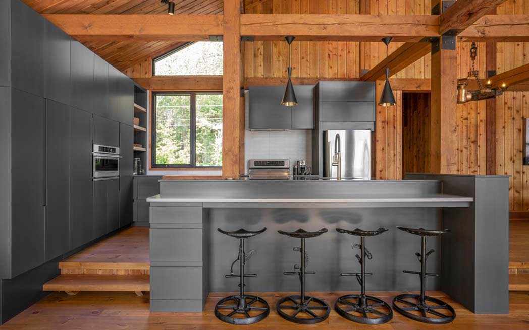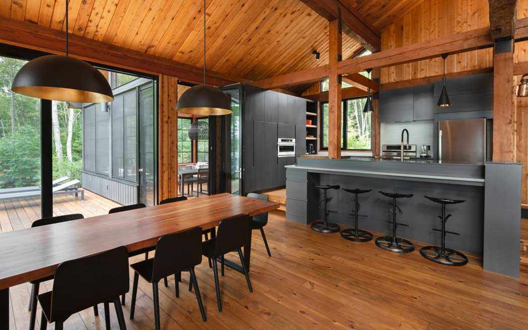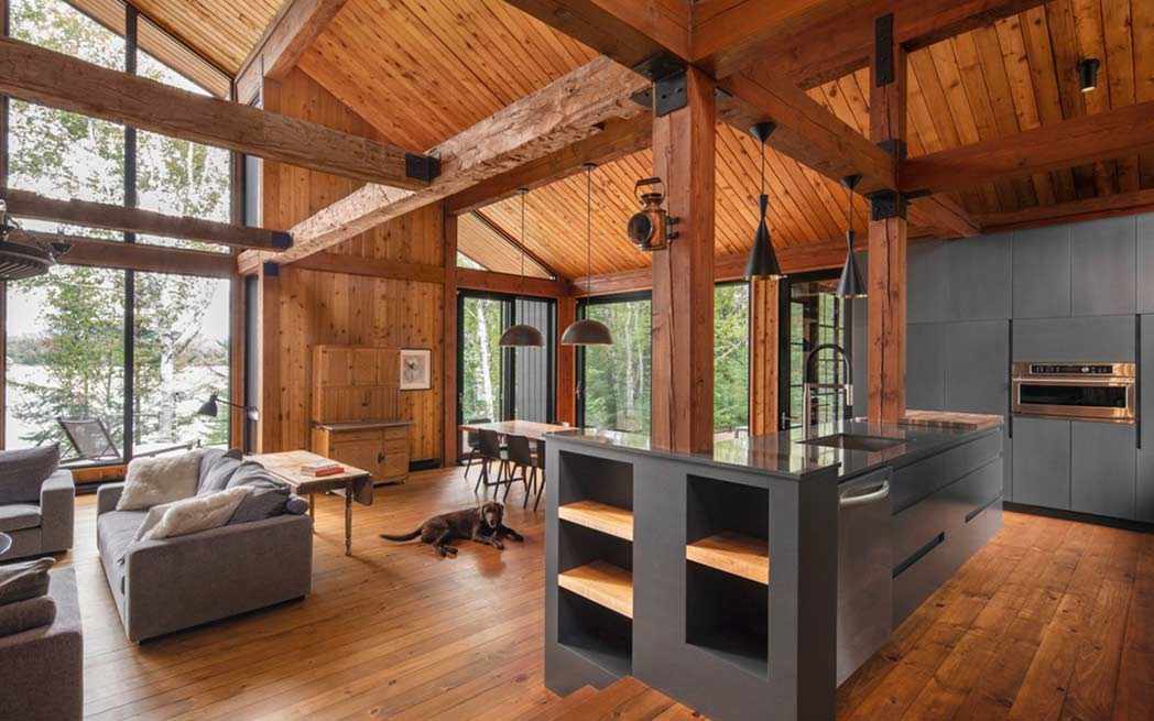 Construit il y a plus de 40 ans par le père du présent entrepreneur, ce chalet familial nécessitait d’importantes transformations pour répondre adéquatement aux besoins des propriétaires actuels tout en le rendant plus confortable en été comme en hiver. Les clients avaient la volonté de conserver le cachet existant tout en créant des environnements au goût du jour. L’ajout de zones extérieures pour profiter de la nature et la création d’espaces pour faciliter le départ et l’arrivée des activités sportives étaient au coeur des priorités.