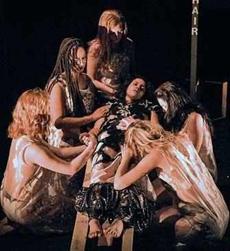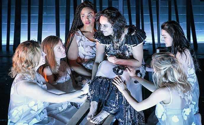 In the English version at the Theatre La Chapelle, they are portrayed by a fine female sextet of Cleopatra Boudreau, Rebecca Gibian, Gita Miller, Michelle Langlois-Fequet, Kathleen Stavert and Julie Trepanier. There is a token male, Christian Daoust, in a brief cameo.