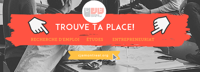 Le Carrefour Jeunesse-Emploi Montréal Centre-Ville, en concertation avec le milieu, accompagne les jeunes de 16 à 35 ans qui résident au centre-ville, y transitent ou le fréquentent, en les motivant et les encadrant, dans la poursuite de leurs projets éducatifs, professionnels, créatifs ou d’entrepreneuriat visant à trouver leur place sur le marché du travail montréalais et ailleurs. cjemontreal.org