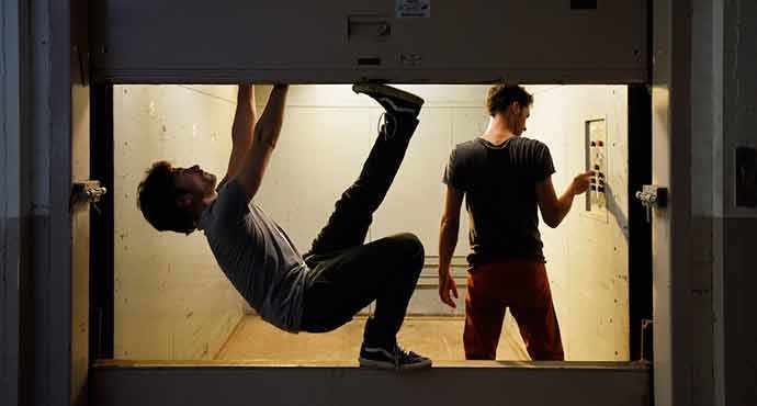 Pour terminer, Monte-Charles, une création et une interprétation de Philippe Meunier et Ian Yaworski, accompagnés par Sébastien Chalumeau, Jonathan C. Rousseau et Antoine Turmine. Cette chorégraphie hors-norme est à la fois un spectacle de gigue contemporaine et une exploration in-situ de l’édifice Wilder par le biais de l’utilisation du monte-charge industriel de service, où s’entassent les membres de l’auditoire (avec la contrainte d’un nombre limite de 26 personnes par cargaison, ce qui divise l’auditoire en deux groupes).