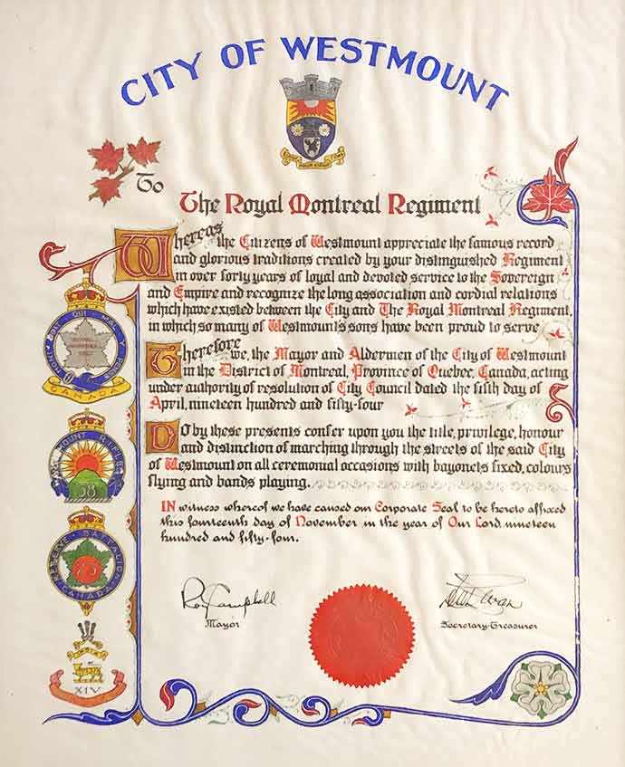 That the City of Westmount confer upon The Royal Montreal Regiment (MG) the title, privilege, honour and distinction of marching through the streets of the City of Westmount on all ceremonial occasions with bayonets fixed, colours flying and bands playing; and