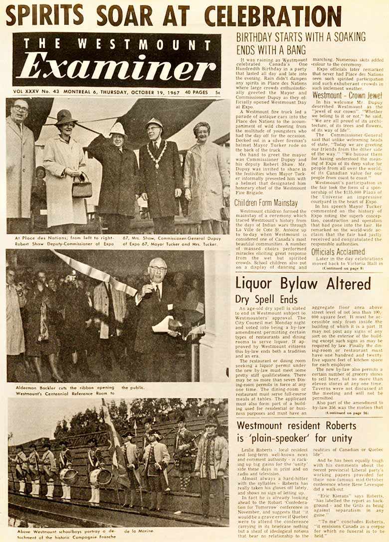 Whereas October 17, 1967 was declared Centennial Day in Westmount: Whereas the official dedication ceremonies, in the evening, of the Centennial Reference Room in the Westmount Library, the newly re-built Melville Sailing Pond and the Royal Canadian Engineers’ Centennial Flagpole emplacement in Westmount Park, were so well attended by Westmount Citizens…