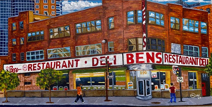 The painting accurately portrays the exterior of the building and gives us a glimpse inside via the windows. Ben’s was an iconic landmark in downtown Montreal, and its interior included the Poets’ Corner, where literary luminaries such as Louis Dudek and Leonard Cohen met. No doubt many readers have memories of Ben’s as diners and passers-by, with a few who met Cohen and the other poets who regularly gathered at the famous deli.