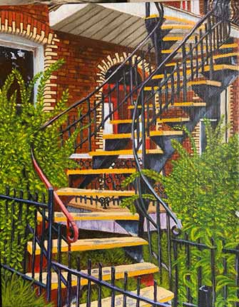 Underwood: I am influenced and inspired by nature around me. I find myself constantly looking at shapes, colours, and hues. A lot of my inspiration also comes from studying other artists’ styles and movements. My love for Montreal comes through my paintings of my beloved city. As a child, I was always interested in the architectural styles of Montreal. The beautiful churches, old Montreal’s Art Deco and Victorian structures, spiral stairs unique to Montreal, and the list goes on! Painting Montreal scenes always takes me back to my childhood living in the bustling inner city.