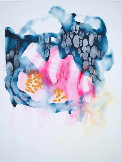 We move from quiet works where translucent washes are overlaid with delicate under-drawings and tonal brush-marks to more forceful pieces that play with geometric shapes and bold gestural flourishes across a terrain of saturated, brilliant hues – cadmium yellow, vermillion, pthalo blue. Each painting seems anchored in its own internal reasoning and experienced moment, especially evident in the several series the artist has pursued over the last few years. Thus, there is an unabashed courage in these works emerging from what seems to be a sincere desire to know and understand the world through paint.