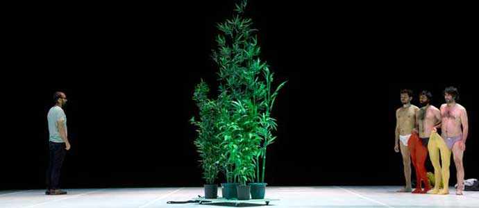 An empty stage. A woman appears, her back to the crowd and introduces the play. And here, ‘play’ takes on its full ludic character. Four actors step up onstage and they will ‘play’ on the themes of ten European cities – Madrid, Berlin, Marseille, Lisbon, Kiev, Brussels, Thessaloniki, Warsaw, Lanzarote and Florence – offering details about these destinations by way of information disclosed on a giant screen. For these four actors will remain silent throughout the performance, and only the female voice will sound, out of scene. And she will reveal only piecemeal information, the giant screen making up for the rest.