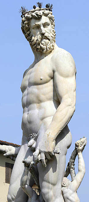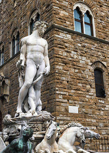 At the corner of the building other male nudes surround a fountain. The Fountain of Neptune by Bartolomeo Ammannati was designed to illustrate Florentine dominion over the sea and is symbolized by the chained sea monsters around and between the legs of the god. The fountain was finished in 1575 and filled from an ingenious aqueduct especially made to carry water from the Ginevra over a bridge crossing the river Arno and to the fountain. The public was unimpressed and essentially used the fountain as a washstand.