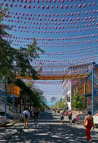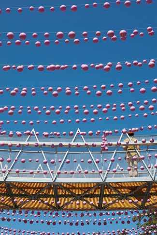Tels des équilibristes, les visiteurs flottent doucement 6 mètres au-dessus de la rue Ste-Catherine, sur une rivière multicolore de boules de plastique. Le plancher ajouré en caillebotis donne l’impression de se poser sur des fils tels des oiseaux. Certains visiteurs peuvent même y vivre « ’l’effet de pont suspendu »’ et tomber en amour! (Capilano Suspension Bridge experiment study, Donald Dutton and Arthur Aron, psychologists, 1974)