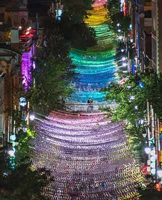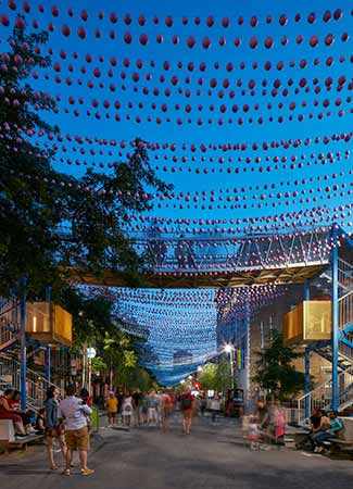 FunambOule est une passerelle piétonne estivale qui permet aux visiteurs de monter au-dessus de la rue Sainte-Catherine pour profiter d’un point de vue nouveau et d’une expérience inédite de la célèbre installation de boules suspendues de Claude Cormier. Elle est conçue pour être démontée et réinstallée chaque printemps. Sa conception technique, une structure autoportante déposée au sol, permet de la positionner chaque année dans un tronçon différent de la rue Sainte-Catherine dans le Village gai.