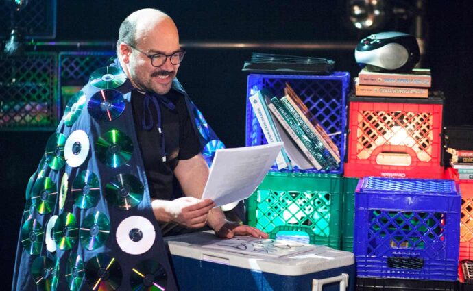 Mathieu Gosselin nous invite dans son univers et se dévoile doucement à travers sa poésie sur une scène encombrée d’un vieux lecteur de disques compacts, de piles de poèmes et de t-shirts noirs avec différents noms de groupes rock imprimés dessus. Le comédien nous fait ainsi part de ses doutes en alliant performance musicale, stand-up ludique et poésie.