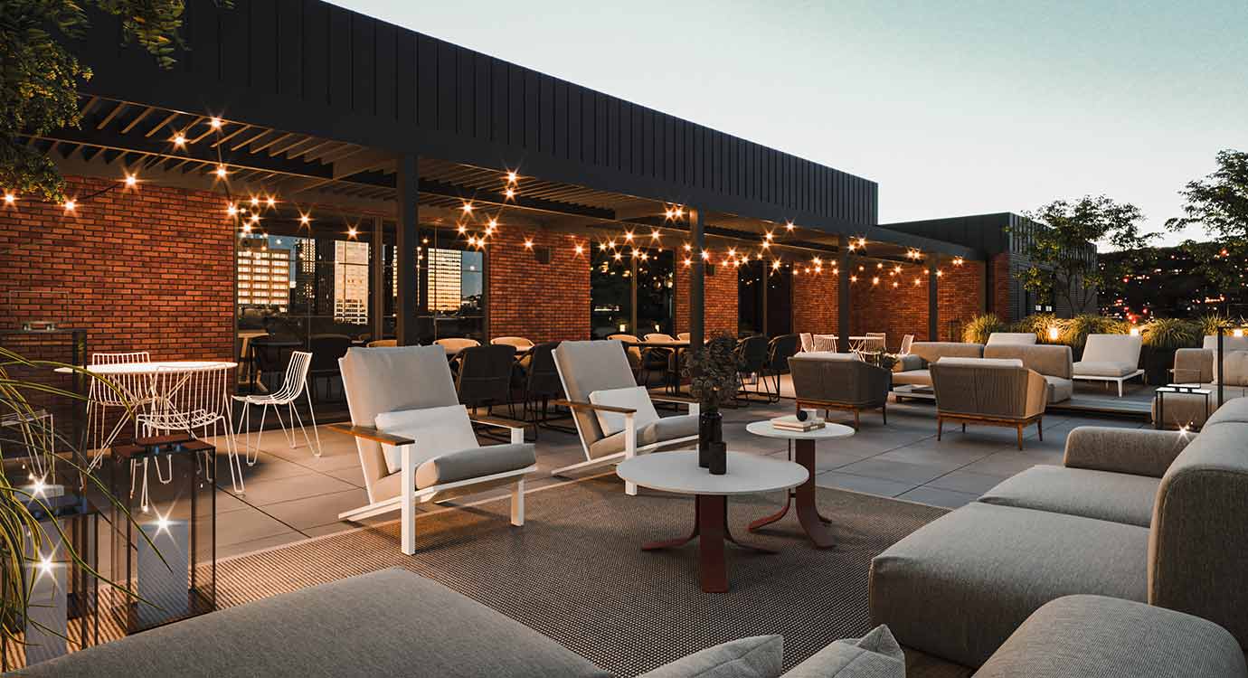 Let yourself be enchanted by the rooftop terrace, a lush elevated green oasis with panoramic views, where you can relax or enjoy get-togethers with friends.