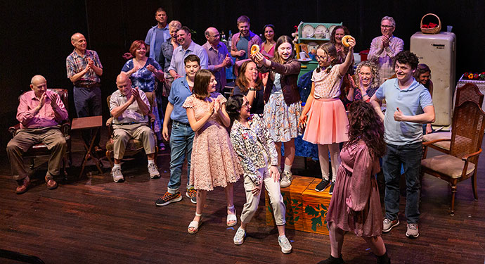 Featuring 23 singer/dancer/eater performers ranging in age from some young tots to veterans of the genre, with music directed by Nick Burgess and choreographed by Deborah Friedman, it was performed in Yiddish and English with a sprinkling of French, Hebrew, and Ladino, supplemented by Super titles overhead. Special Yiddish diction coaches were performers Bronna Levy and Sam Stein, plus stage manager Jeremy Pinchuck.