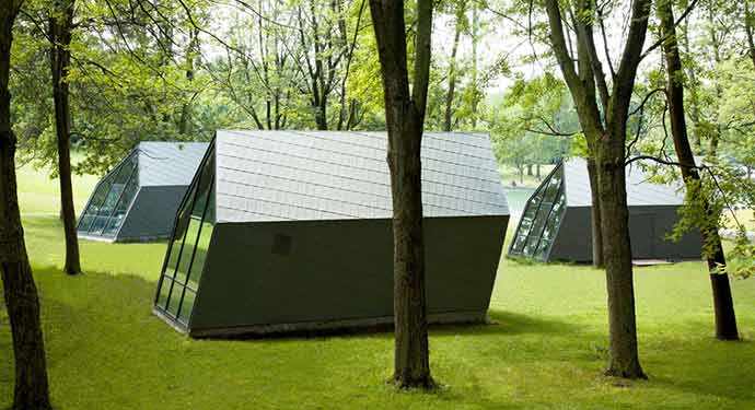 La forme et la transparence de leur construction présentent une légèreté d’ensemble : trois «cabanes» déposées dans le parc, à la fois visibles et invisibles à travers les bois.