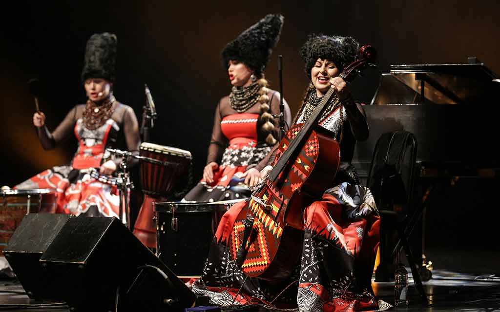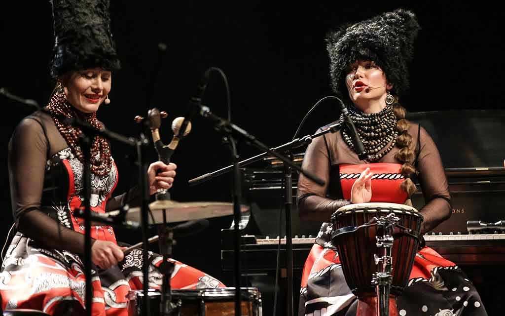 En finale de ce concert, le groupe DakhaBrakha – donner et prendre, en ukrainien – de Kiev. Ils ne se gênent pas pour clamer haut et fort une Ukraine « forte et libre », drapeau en main. Un quatuor composé d’Irina Kovalenko, de Marko Halanevych, de Nina Garenetska et d’Olena Tsybulska, qui, bien qu’entonnant des chants traditionnels – et ici, les voix et arrangements vocaux sont typiquement d’Europe de l’Est, tout en dissonance et en polyphonie, comme le Mystère des Voix Bulgares – réinvente cette tradition au moyen de rythmes, d’une musique complètement déjantée et ultra-moderne au moyen d’instruments fort simples, tels qu’accordéons, tambours et tam-tams, violoncelle, flûte, piano, harmonica.