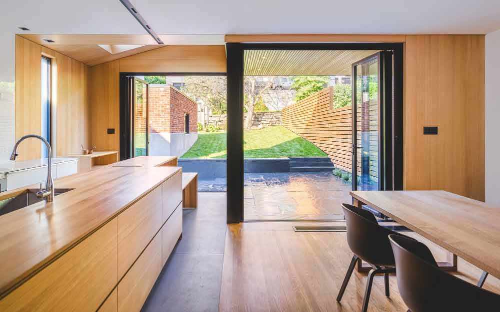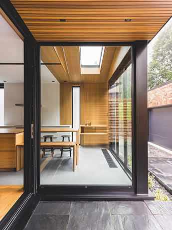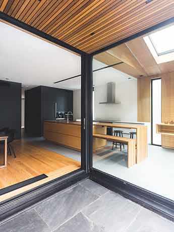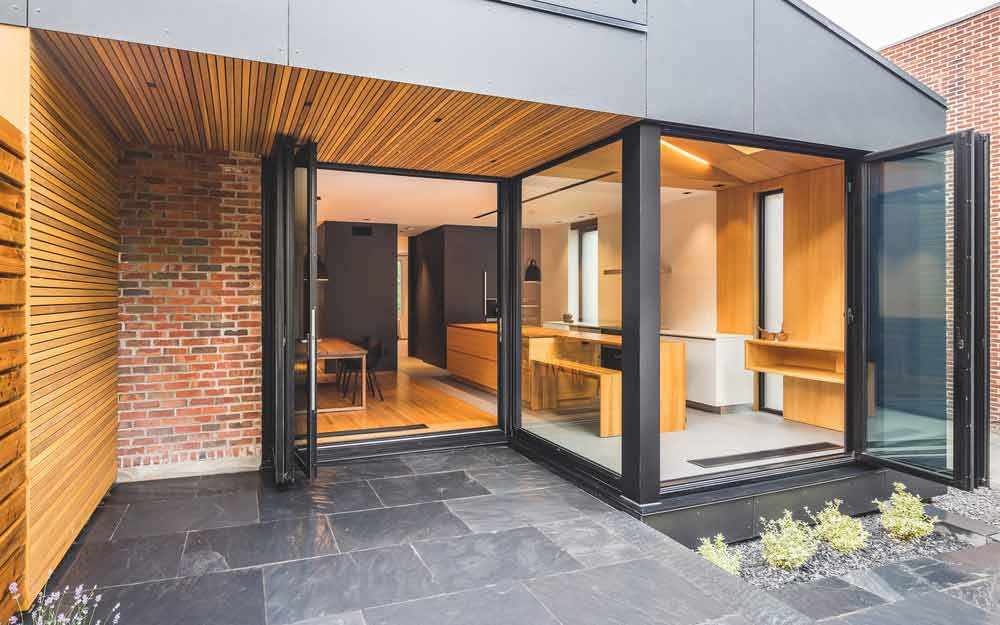 De grandes fenêtres s’ouvrent, se déploient et le jardin devient partie intégrante de la maison. Les matériaux intérieurs et extérieurs dialoguent afin de mettre en relation les espaces. Dedans, les lambris de bois blond couvrent les murs et le plafond de l’appentis, alors qu’un lattis de bois de cèdre de l’Ouest revêt les surfaces extérieures couvertes. Les dalles d’ardoise de la terrasse jouxtent le plancher de porcelaine d’allure béton de la cuisine. Héritage du passé, le plancher de bois original en chêne de la salle à manger, conservé et restauré, a donné le ton. Ainsi l’îlot, en bois de chêne massif, est monumental au centre et fait office d’autel pour le rituel des repas. Au périmètre se dresse, plus sobrement, le mobilier blanc ou noir.