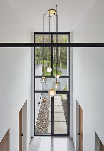 Le terrain en pente douce vers le lac, qui présentait des défis de taille, accueille ainsi une volumétrie déployée selon la topographie spécifique à l’intérieur des marges, hors des zones humides et des bandes de protection riveraines. La dalle du rez-de-chaussée se déploie en suivant le dénivelé. Dans le respect de la vue majestueuse, quelques marches séparent l’entrée des aires de vie, ainsi que la salle à manger du salon, permettant ainsi une vue parfaitement dégagée sur l’horizon depuis chaque zone de la maison.