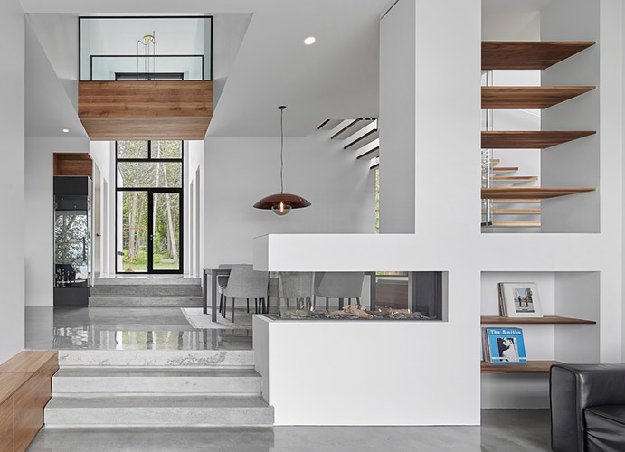 Salon, salle à manger et cuisine s’organisent au niveau du rez-de-chaussée, tandis que les aires intimes formées par les chambres sont à l’étage. Un bureau tout en transparence, également à l’étage, a été placé au cœur de la maison, et offre une vue sur le lac et sur la passerelle centrale qui surplombe l’entrée principale. De plus, un garage-studio, construit séparément, permet de loger des invités à l’étage, tout en remisant une embarcation au rez-de-chaussée.