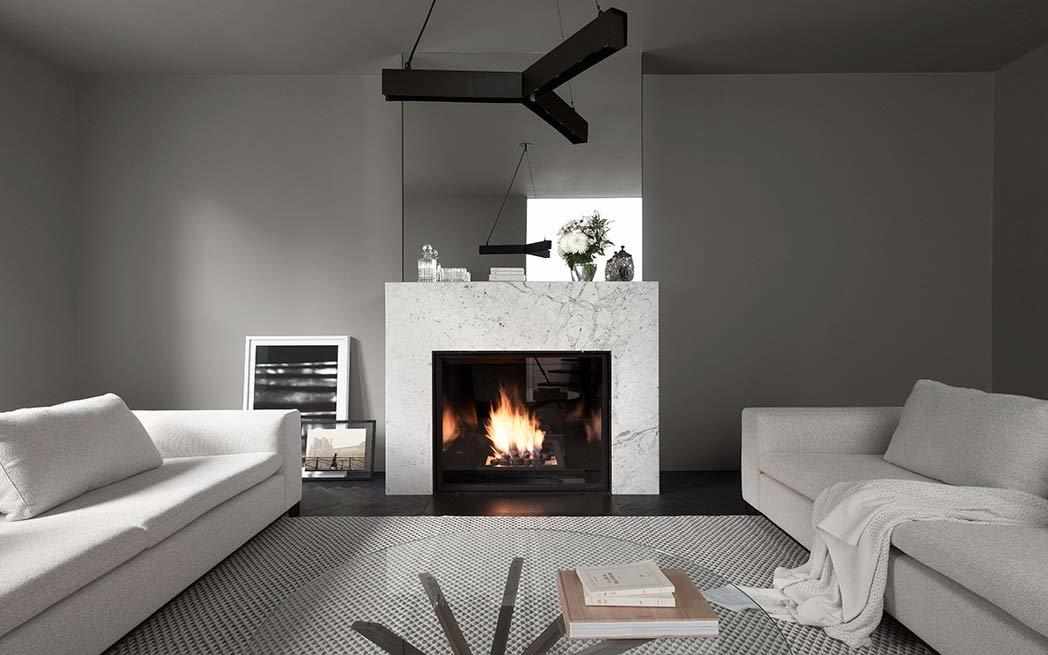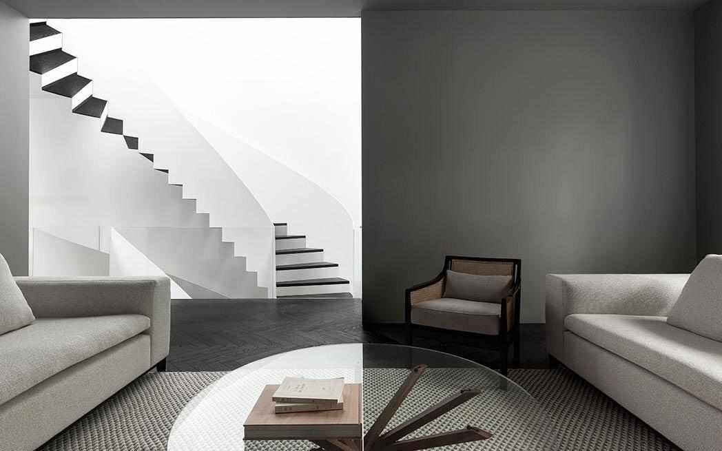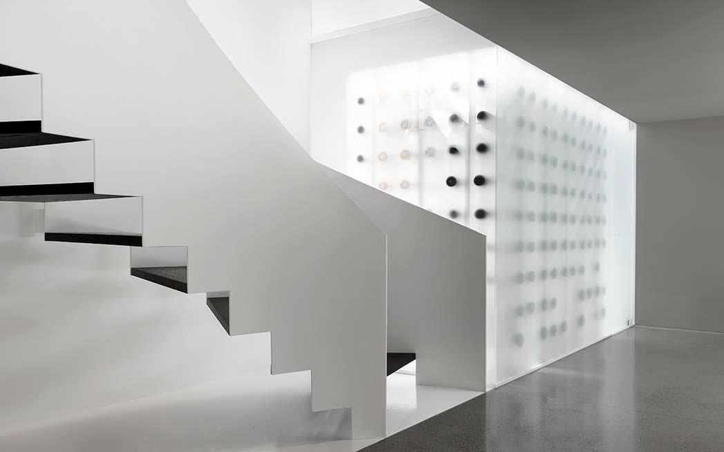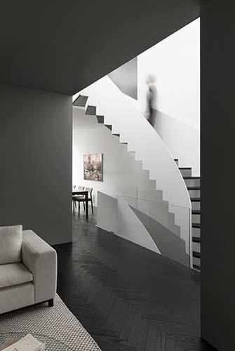 Habitée par un couple qui aime recevoir, la Maison du Parc a été conçue pour ses occupants, mais également pensée pour les invités. Dès l’arrivée, la courbe hypnotisante d’un escalier surmonté d’un puit de lumière nous accueille dans un univers graphique maitrisé. La dureté du marbre, les tonalités monochromes et le minimalisme ambiant confèrent à la résidence une élégance et un raffinement brut, à la beauté presque intimidante.