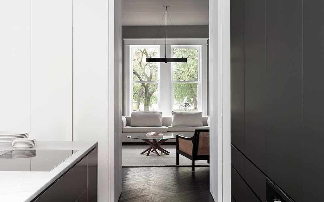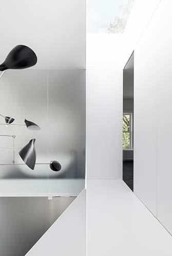 Si l’arrière est contemporain grâce à sa façade entièrement vitrée, l’avant de la résidence conserve quant à elle la configuration des pièces d’origine. Les espaces sont définis par leur typologie, et par l’utilisation des matériaux où les frontières sont franches, ainsi que par des ruptures de tonalités qui créent des contrastes saisissants.