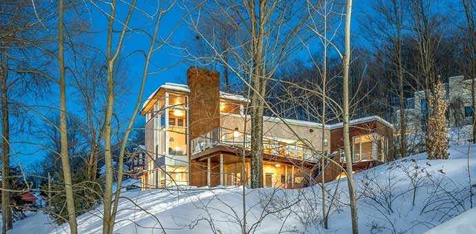 Majestueusement déposée sur son nichoir boisé au cœur des Cantons de l’est, cette maison de campagne désire à la fois dominer et se fondre au décor. Cette dualité se manifeste par intermittence grâce à sa vaste fenestration qui nous fait vivre la montagne à même son intérieur et à la fois par ses lignes bien définies déchirant le ciel; le tout surplombant savamment la vallée de Bromont.