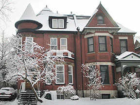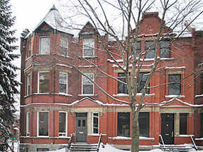La maison du docteur J. M. Elder (1900) disposait d’un bureau et une salle d’attente à l’avant du rez de chaussée, très probablement les bureaux médicaux du propriétaire, avec une entrée séparée sur la rue Sherbrooke. Le hall d’entrée privée, dans l’axe avec l’entrée latérale sur Mont Pleasant, dispose d’un siège niché dans l’escalier principal en spirale. La salle à manger et la cuisine sont à l’arrière. A l’étage, au-dessus des bureaux à l’avant de la maison, un salon pleine largeur est éclairé par une fenêtre fenêtre en encorbellement, tandis que les principales pièces donnent sur l’arrière. L’étage au grenier dispose de trois chambres de plus, une chambre de domestique, une salle de bains et une salle de couture. Les élévations révèlent une interprétation ludique des maisons urbaines néerlandais, avec leurs pignons étagés. L’un est placé au centre de la façade avant sur Sherbrooke et deux se trouvent de chaque côté de l’entrée, sur l’avenue Mount Pleasant. (Centre canadien d’architecture)
