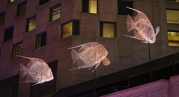 A key aspect of LUMINO lies in the dialogue it creates between public art, tourism, and the hotel industry. One of the best examples is Les Voyageurs by Cédric Le Borgne—a series of luminous figures suspended outside five downtown hotels*, forming a visual thread that connects these establishments to the public realm.