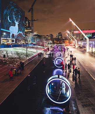 The Quartier des spectacles is Montreal’s cultural heart, boasting North America’s most concentrated and diverse group of cultural venues. The district is the year-round host to countless festivals and events, many of which include free outdoor shows and activities. The Quartier hosts innovative urban installations involving cutting-edge lighting design, immersive environments or interactive digital spaces. The Quartier des spectacles is a showcase for new multimedia technology, making Montreal a global leader in the field. For more information, visit quartierdesspectacles.com