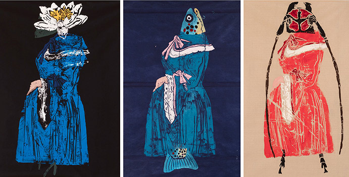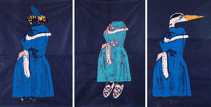 For this exhibition, Lyne Lapointe has imagined a hybrid character, a woman/animal, whose body is that of a pregnant woman and whose “extremities” belong to animals. This is how we discover La femme-héron, La femme-mouton, La femme-beeille, La femme-louve and several others.