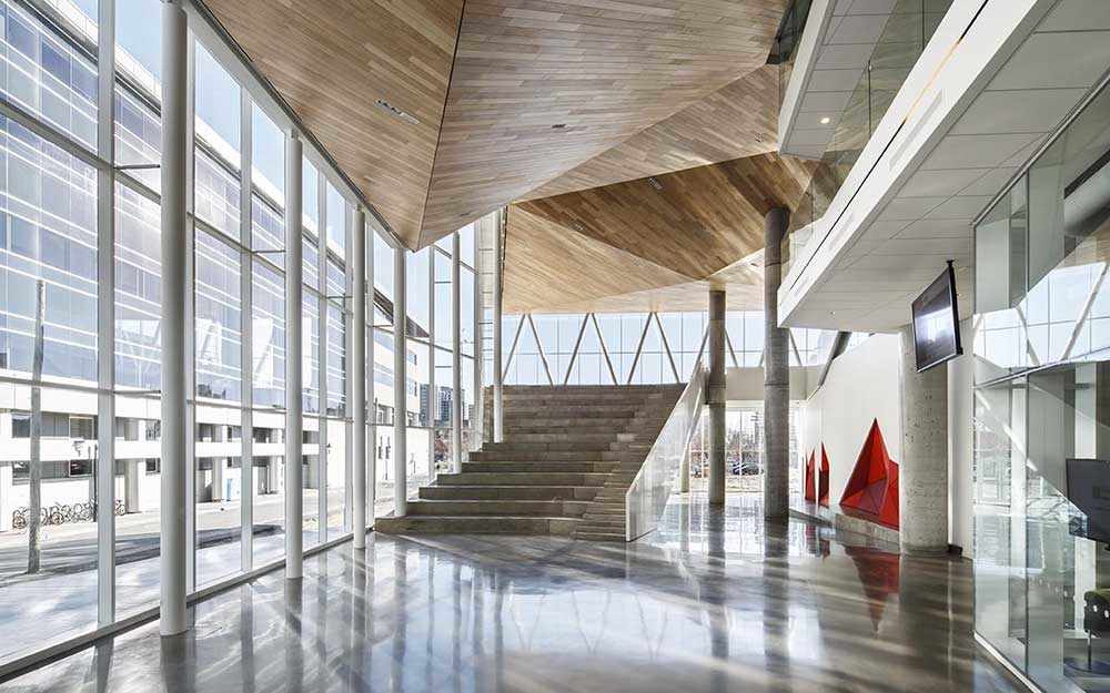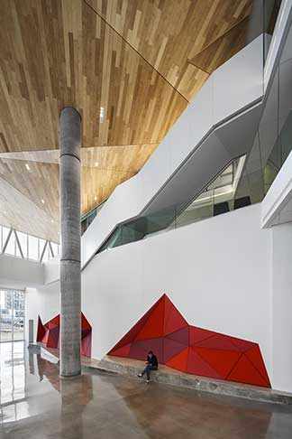 En continuité avec le parc, l’atrium se présente comme un vaste paysage intérieur évoquant une topographie inversée dont le plafond est fait de lattes de merisier. Rappelant les ponts des chemins de fer et les anciennes structures industrielles du secteur, une impressionnante ferme d’acier structure et rythme l’espace de l’atrium. Celle-ci soutient un gradin en porte-à-faux au-dessus de l’espace extérieur au sud, offrant de remarquables vues sur le parc et sur Griffintown en arrière-plan.