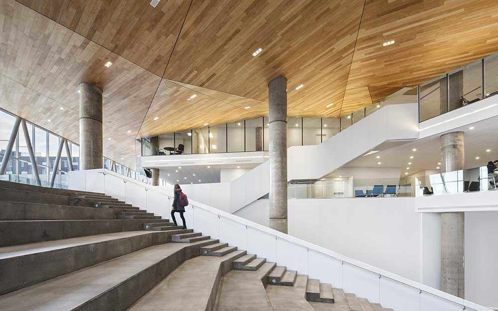 Inspiré par les activités d’un entrepôt de glace qui occupait autrefois le site, le volume de l’édifice a été façonné comme une forme cristalline à la fois légère, ouverte et aérée. Ce volume singulier vient unifier un programme mixte et anime le paysage urbain par un jeu de retraits et de projections en dialogue avec le caractère plus sobre et introverti du campus existant. Au sud et à l’est, la volumétrie a été taillée afin de créer un espace réservé au développement d’un futur parc, en prolongement avec l’espace intérieur de l’atrium. Cette configuration maximise l’ensoleillement des zones publiques extérieures ainsi que l’apport de lumière naturelle à l’intérieur du bâtiment, tout en offrant une vitrine à la vie étudiante de l’institution.