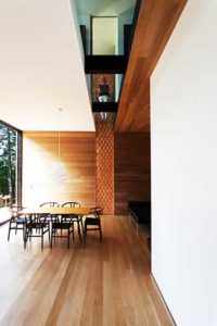 C’est le fractionnement des masses, la composition des deux volumes de bois, l’un clair et l’autre sombre, ce sont les jeux d’opacité et de transparence des structures qui permettent l’intégration de la maison à la nature et de la nature à la maison.