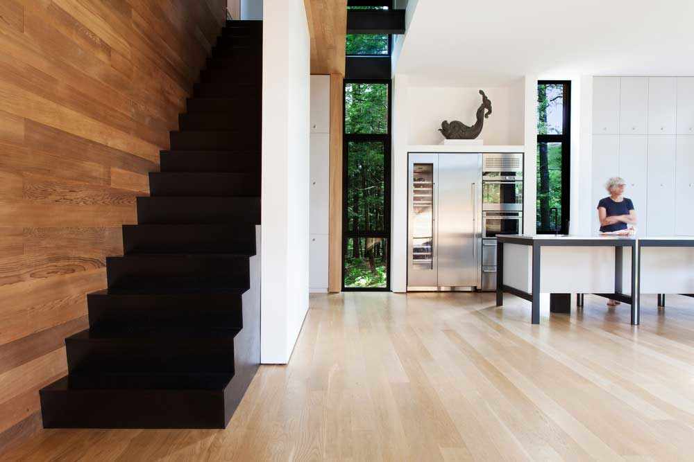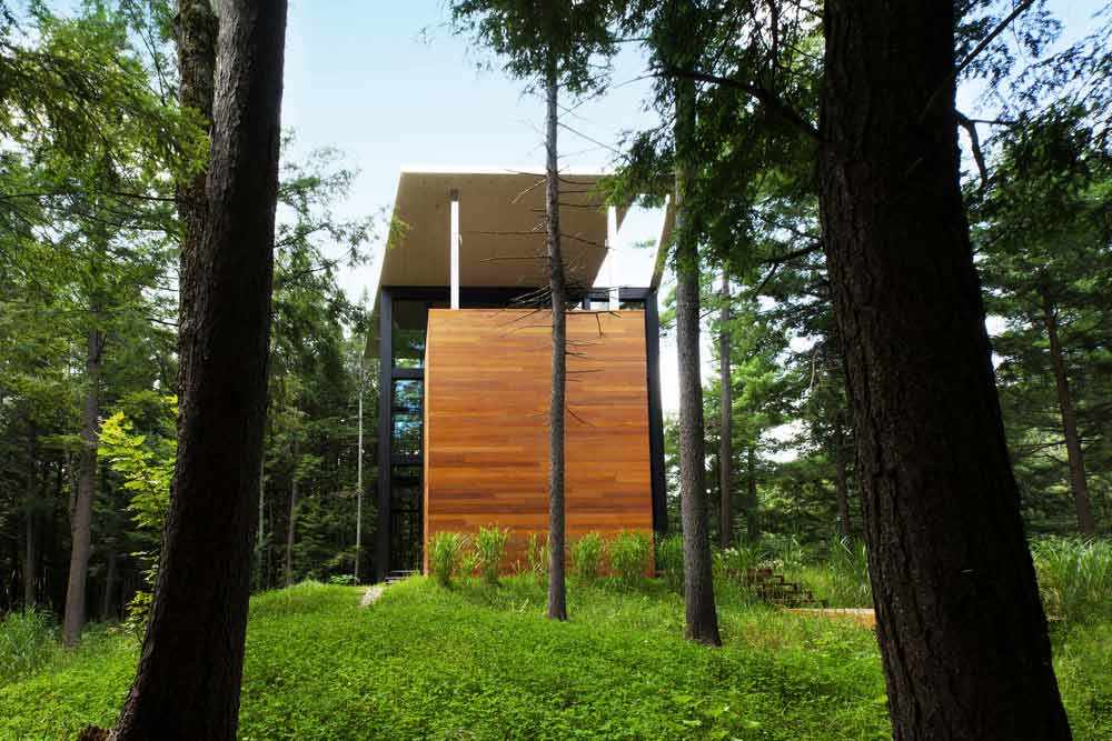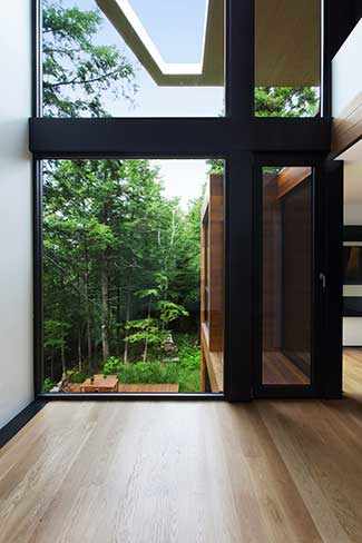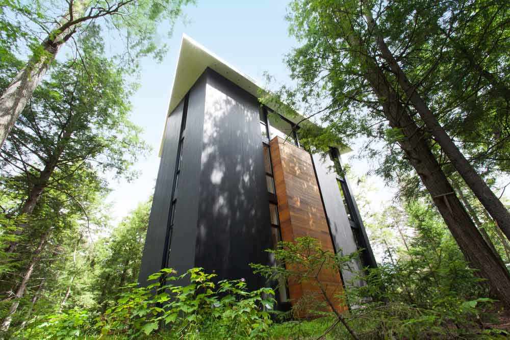 Composition verticale à l’image des arbres matures qui l’entourent, la maison s’ouvre durant le jour à la lumière naturelle et au paysage, grâce à un grand pan vitré s’élevant sur ses trois niveaux. À la nuit tombée, le paysage disparaît et la maison apparaît, telle une lanterne au cœur de la forêt.
