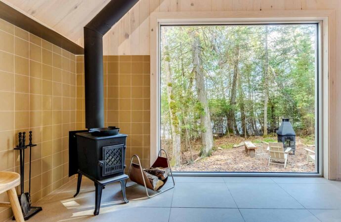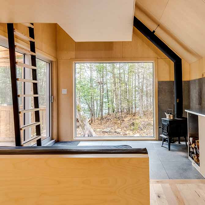Le bois non traité se laisse vieillir et grisonner pour se confondre avec le milieu naturel. Notre empreinte se retrouve à être minimisée, notamment grâce à l’électricité alimentée par panneaux solaires, le chauffage par poêle à bois ainsi que par un choix d’ouvertures dotées d’une performance énergétique élevée.
