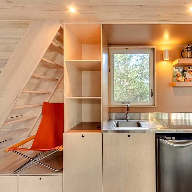 La durabilité étant au cœur du projet, notamment avec l’aspect locatif, on retrouve des comptoirs en acier inoxydable ainsi que de grandes fenêtres en aluminium. Le positionnement stratégique des ouvertures donne une illusion de grandeur à ces petits espaces et la plus grande fenêtre donne vers la vue la plus convoitée par les visiteurs : le réservoir.