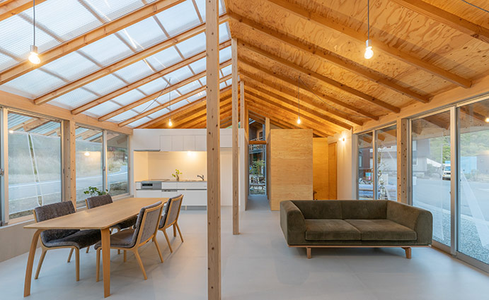 L’espace intérieur est prolongé par des ouvertures jumelées, un toit léger et des avant-toits profonds, et de grandes lumières au sommet amènent les arbres et le ciel bleu à l’intérieur. Et en imbriquant les pièces, une zone intermédiaire a été créée, brouillant l’intérieur et l’extérieur du bâtiment. En outre, les deux piliers placés au centre du grand espace, en tant qu’éléments architecturaux de petite section transversale, donnent à l’espace un sentiment de calme, comme des arbres debout dans une forêt.