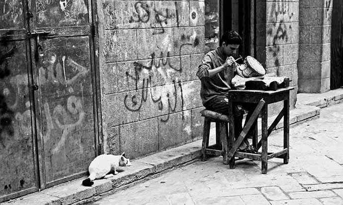 En 2011, quand des centaines de milliers de personnes sont descendues dans la rue lors de la chute d’un président qui a entrainé avec lui le pays dans la tourmente, la rue a changé. Les automobiles se sont frayé un chemin et Muiz est devenue un peu plus comme toutes les autres rues de la ville, avec ses conducteurs agressifs, klaxonnant pour que les gens dégagent la voie, ses jeunes hommes à moto conduisant plus vite qu’ils ne devraient, et qui, vrombissants, vous passent à toute allure.