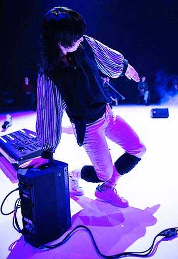 The third and final act of the soirée was Human Synthesizer, with and by Katie Ward, dancer and choreographer, Michael Feuerstack at the helm of the music, both conceptualizing and performing, and Paul Chambers for the lighting and onstage object handler. Here, a discreet memory play was at hand. Objects from the prior performances were onstage: a shoe, fruits, a scaffold, all handled by Paul Chambers, whereas Michael Feuerstack played with the speakers orientation.